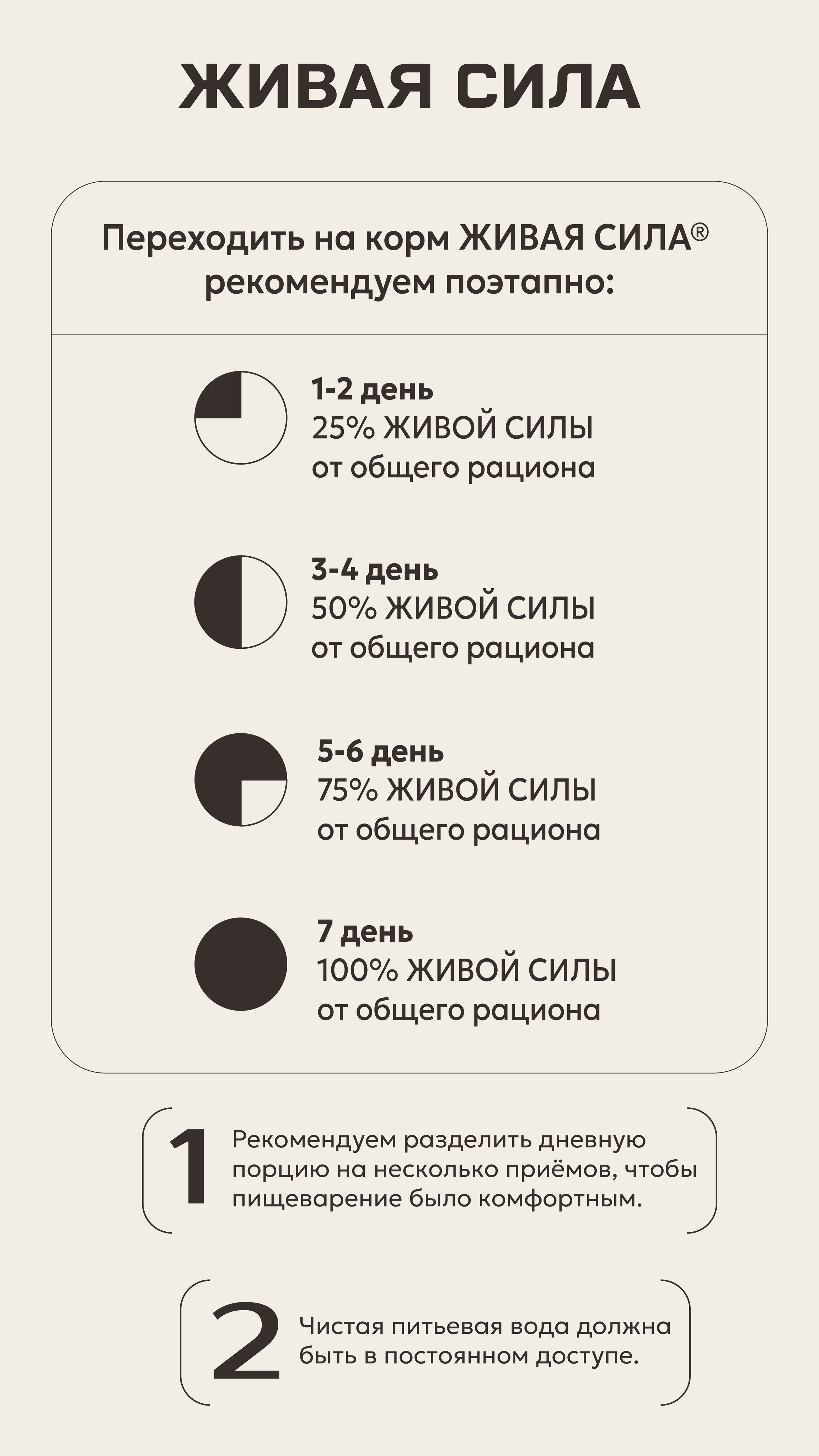 Пищевая ценность (средние значения): протеин 25%, жир 14 %, клетчатка 2,5%, влажность 9%, зола 6,5%, доля жирных кислот омега-3 1,3%, омега-6 3,3%, кальций 1,6%, фосфор 1,3%, глюкозамин 1250 мг/кг, хондроитин 1100 мг/кг, L-карнитин 52 мг/кг. Энергетическая ценность: 3480 ккал/кг.